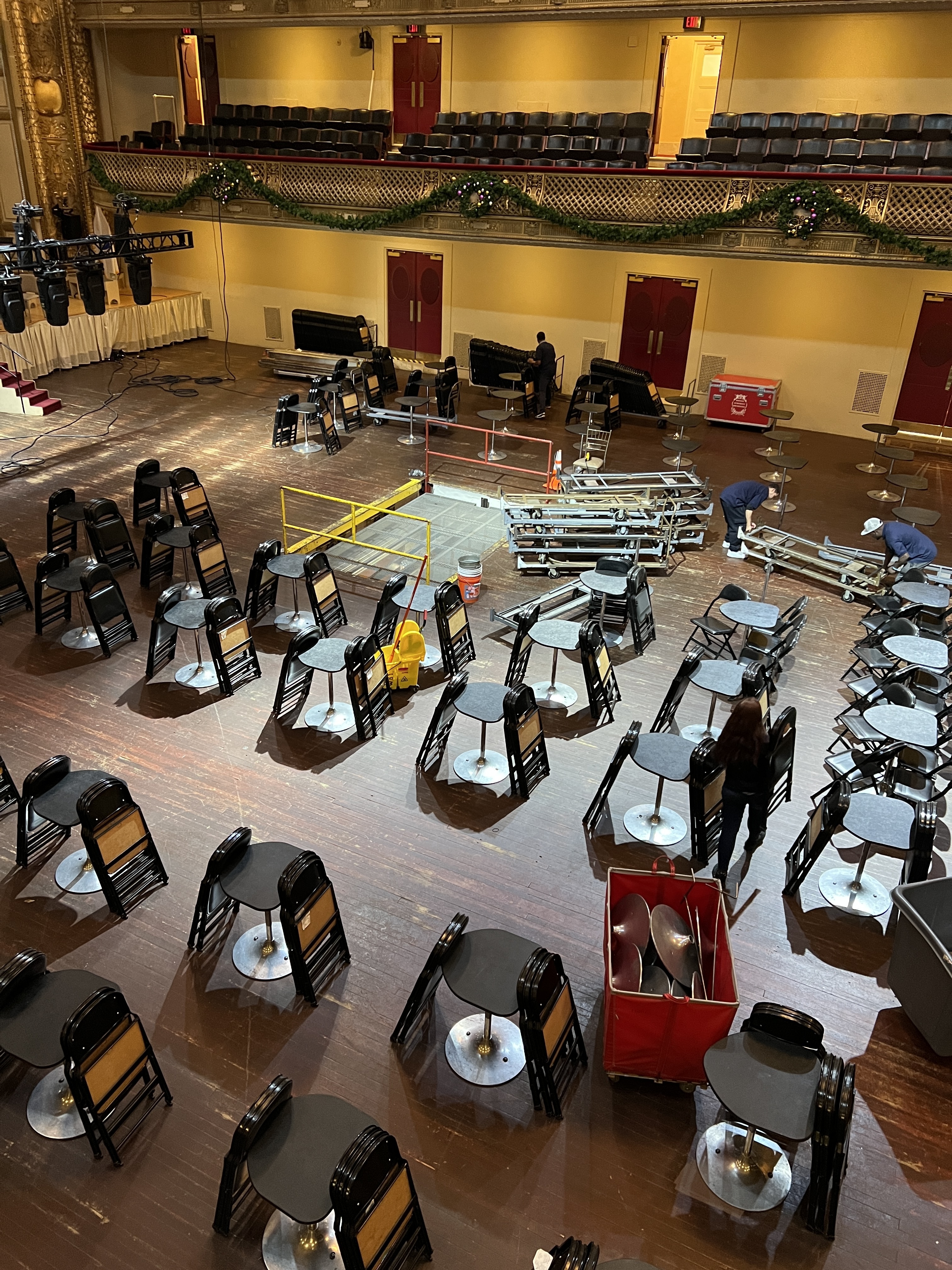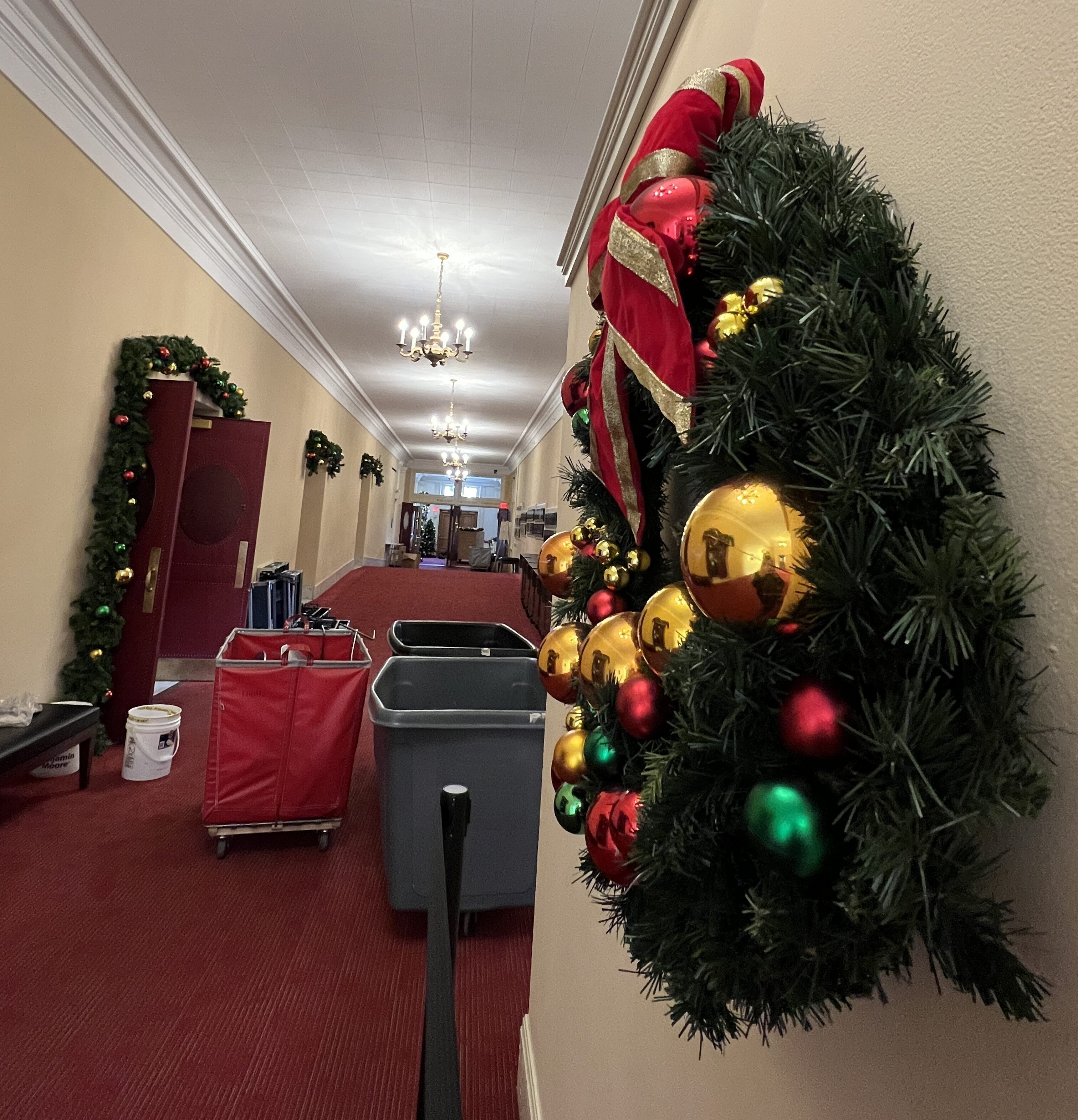 The process takes two days to complete, finishing on the Tuesday after Thanksgiving. Twenty volunteers unpack the decorations and place them following a time-honored plan that adorns the staircases, box office, bars, functions room, lobbies, and corridors. The process is never tedious, but it is exact as volunteers must take care to avoid emergency systems, like the sprinklers and the beam fire sensors. On the second day, a smaller group of about five volunteers returns to review what has been put up and make minor adjustments, including fluffing the garland to make sure that it does not look flat after almost a year in storage.