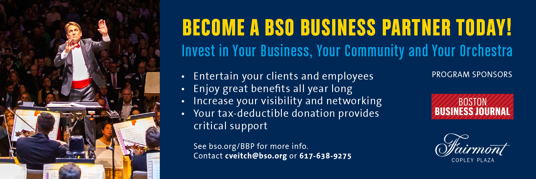 The Boston Pops and Symphony Hall major corporate sponsorships reflect the increasing importance of alliance between business and the arts. The Boston Pops is honored to be associated with the following companies and gratefully acknowledges their partnership. For information regarding BSO, Boston Pops, and/or Tanglewood sponsorship opportunities, contact Joan Jolley, Director of Corporate Partnerships, at (617) 638-9279 or jjolley@bso.org.