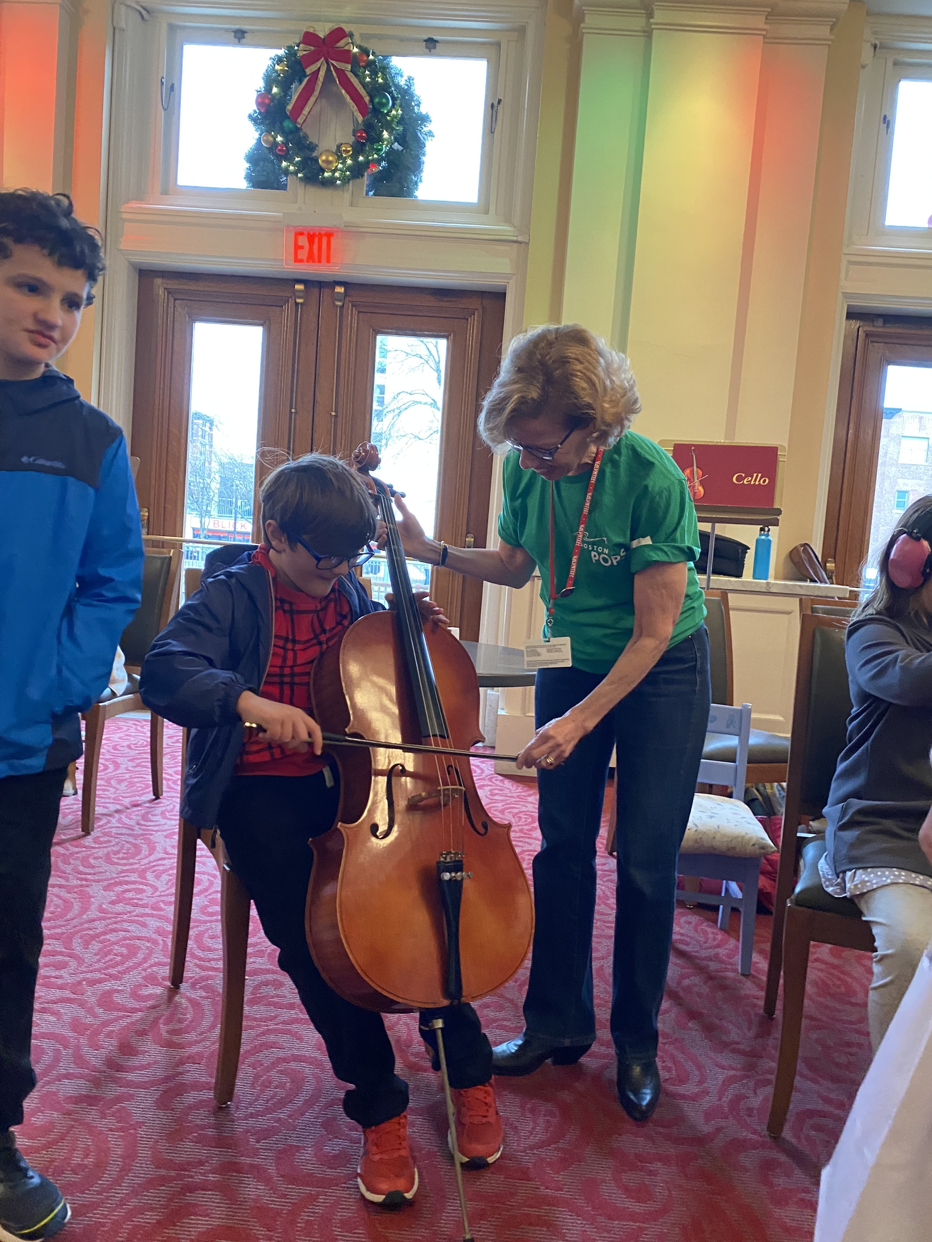 Holiday Pops Sensory Friendly Concert Instrument Playground. Wendy Laurich introduces the cello to a concertgoer. Photo Credit: Rita Paul