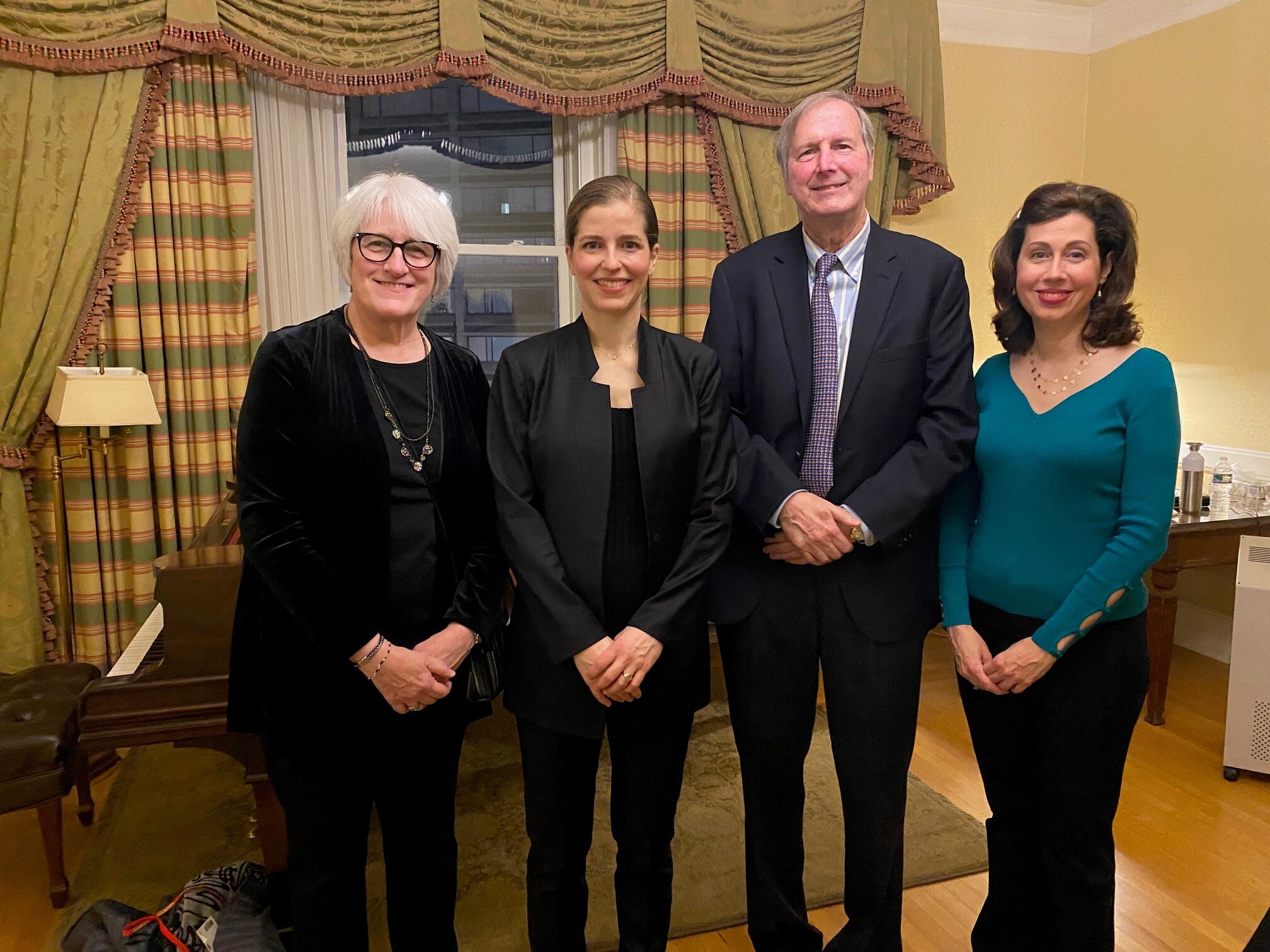 Boston Executive Committee Members Cathy Mazza (far left), Bob Braun (second from right), and Lisa Mafrici (far right) Backstage after Named Concert with Karina Canellakis (second from left.) Photo Credit: Rita Paul