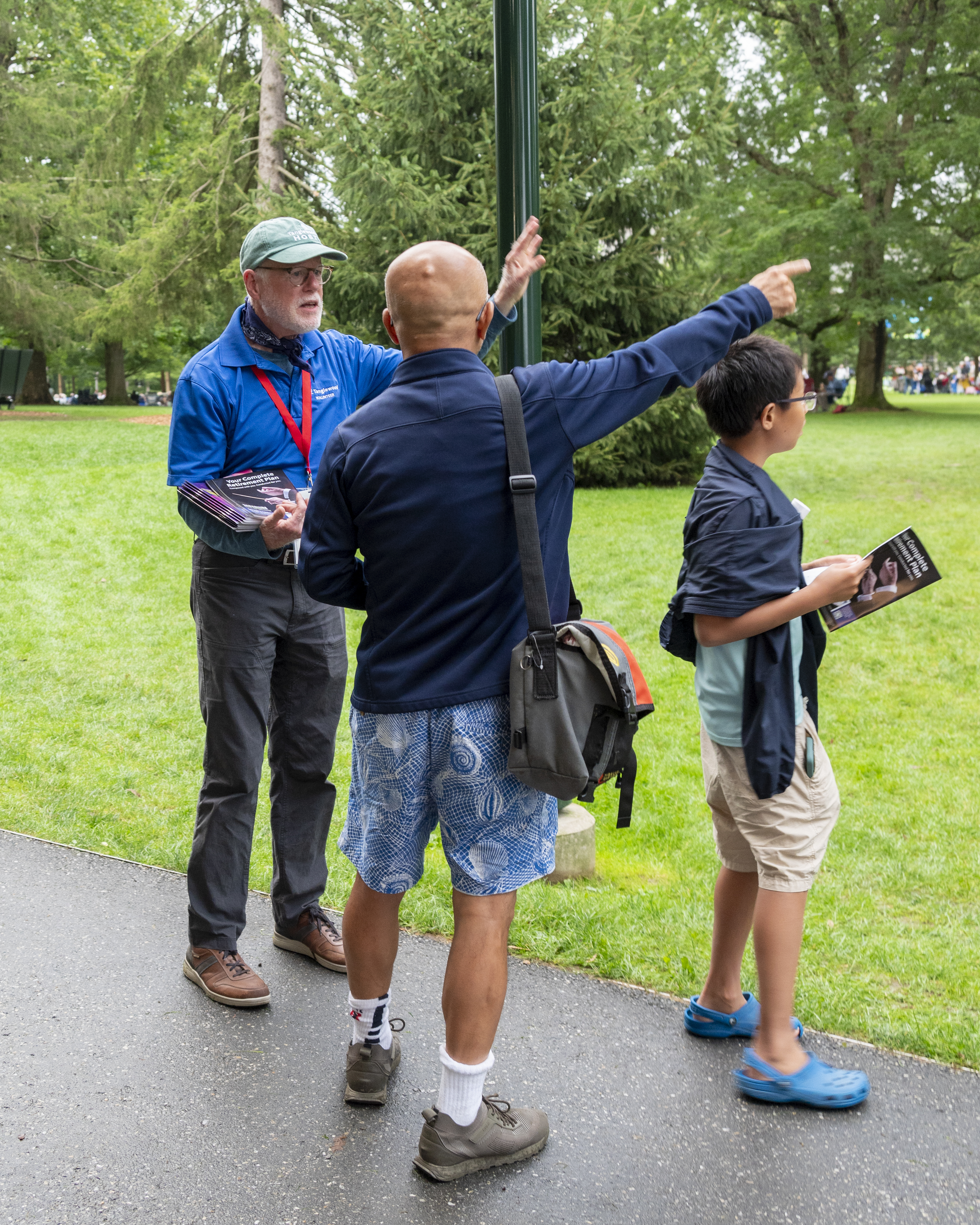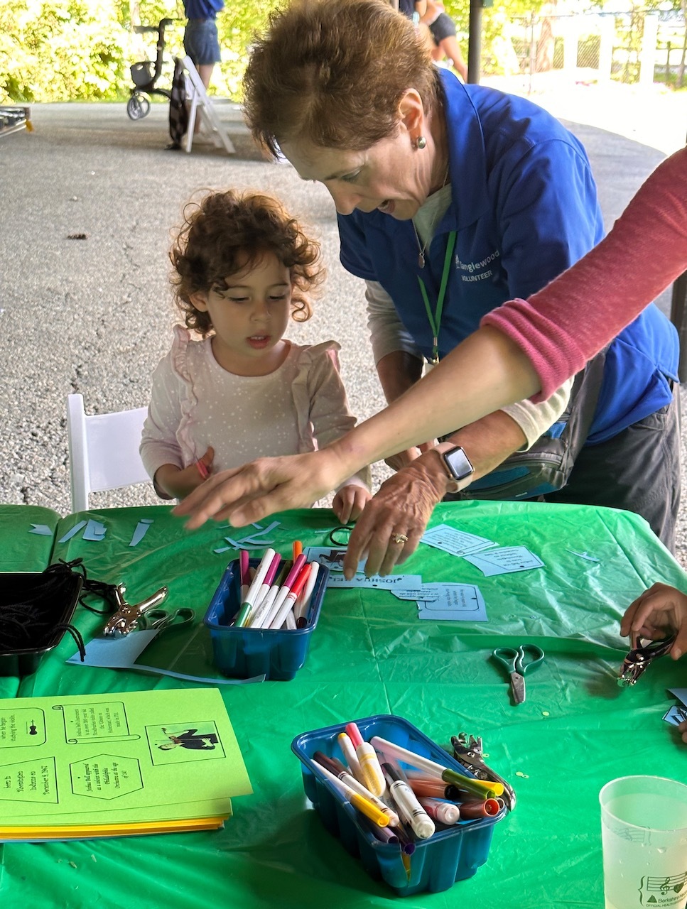 A typical Shed concert on Sunday at Tanglewood requires the services of 50 ushers, 2 tour guides, 6 people to work in the two Glass House gift shops, 4 docents to be at the Tappan House for tours, 27 general hosts, 4 parking hosts, 3 people to assist with mobile ticketing at the gates, 6 people working at the information table helping patrons find restrooms, food stalls and answering questions. There are also 4 parking hosts, who are stationed in various parking lots to greet patrons and remind to take a photo or closely observe where they parked so they can find their car at the end of the concert. There are also 10 volunteers, who do crafts and tattoos, and oversee games on the lawn for the children of patrons Every Sunday there is also an Instrument Playground where children are encouraged to try out an orchestra instrument, working with a volunteer who is trained on that instrument. All Tanglewood volunteers are recognizable because they are clad in a uniform of a blue polo shirt with the Tanglewood insignia and solid pants of black, white or khaki.