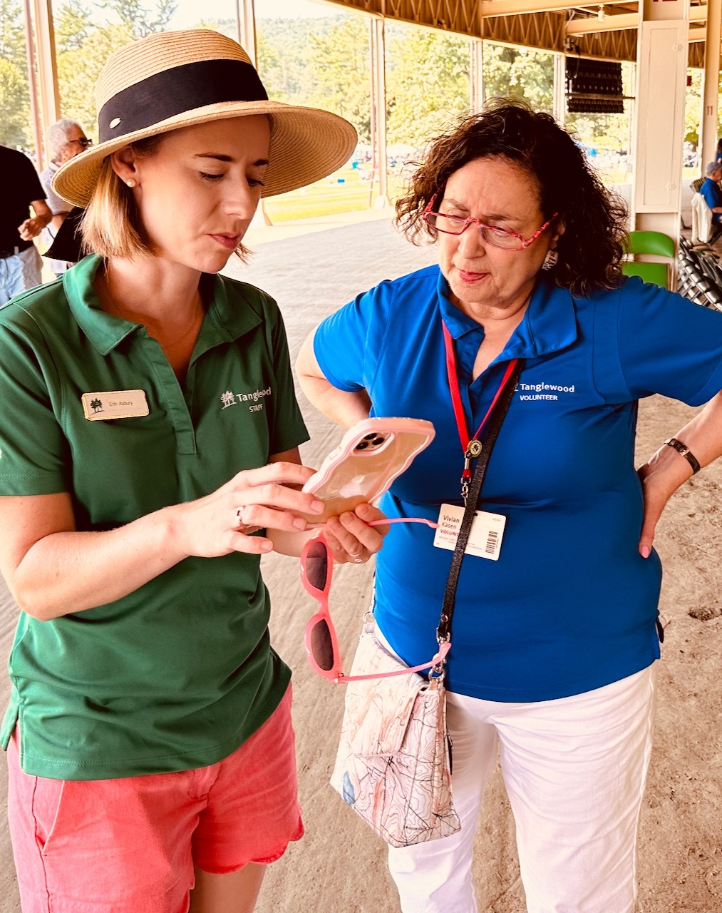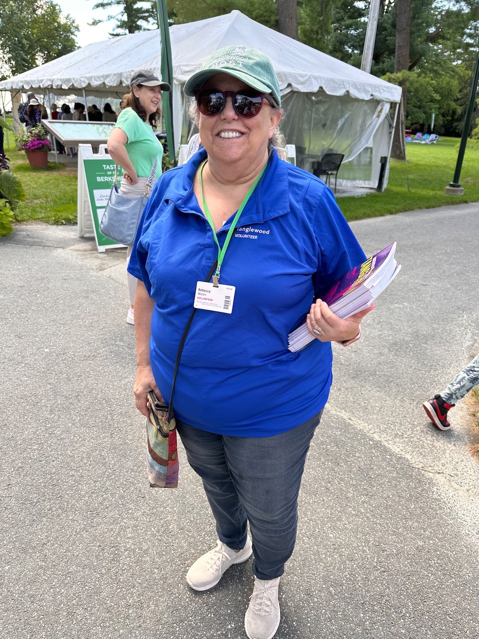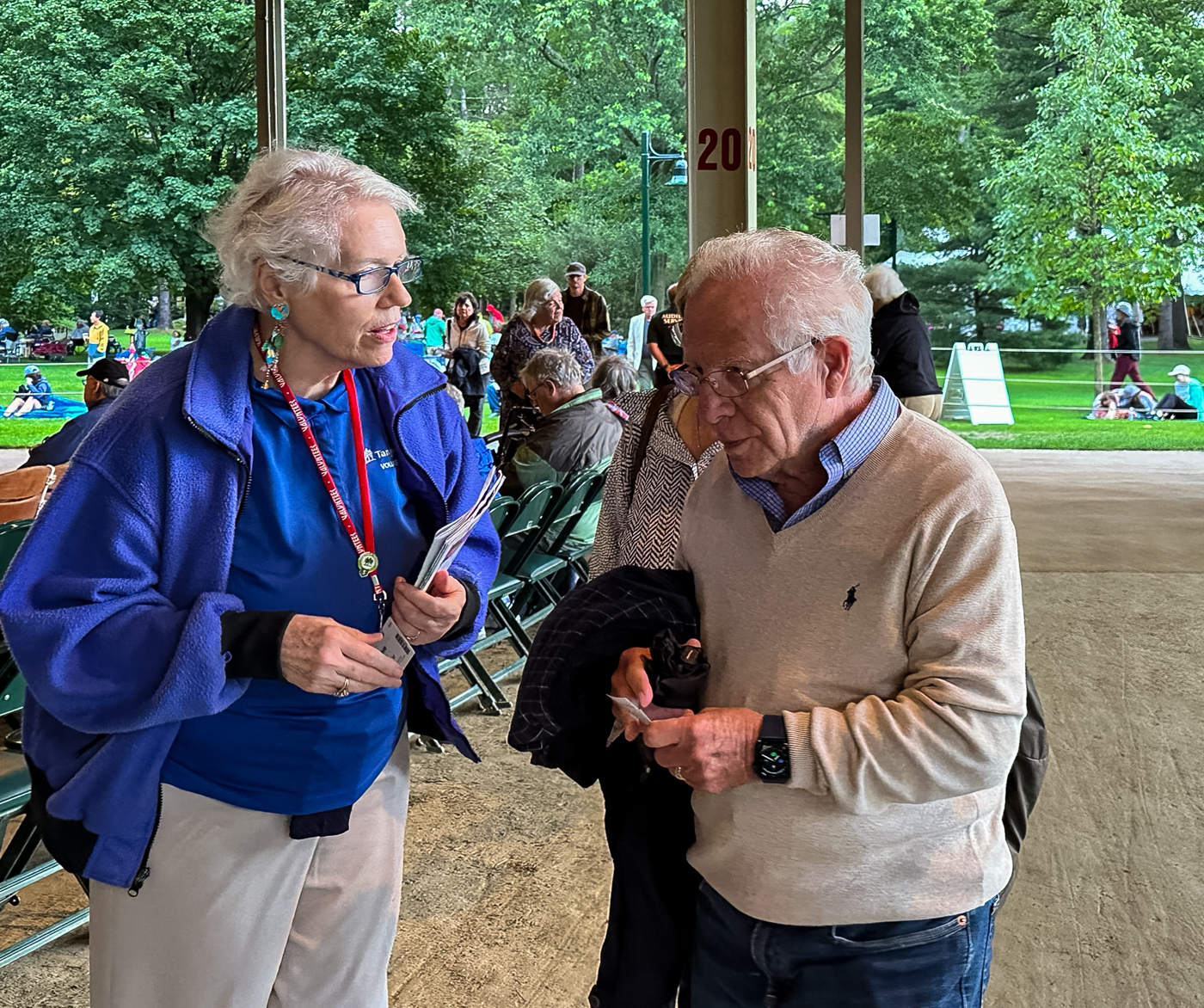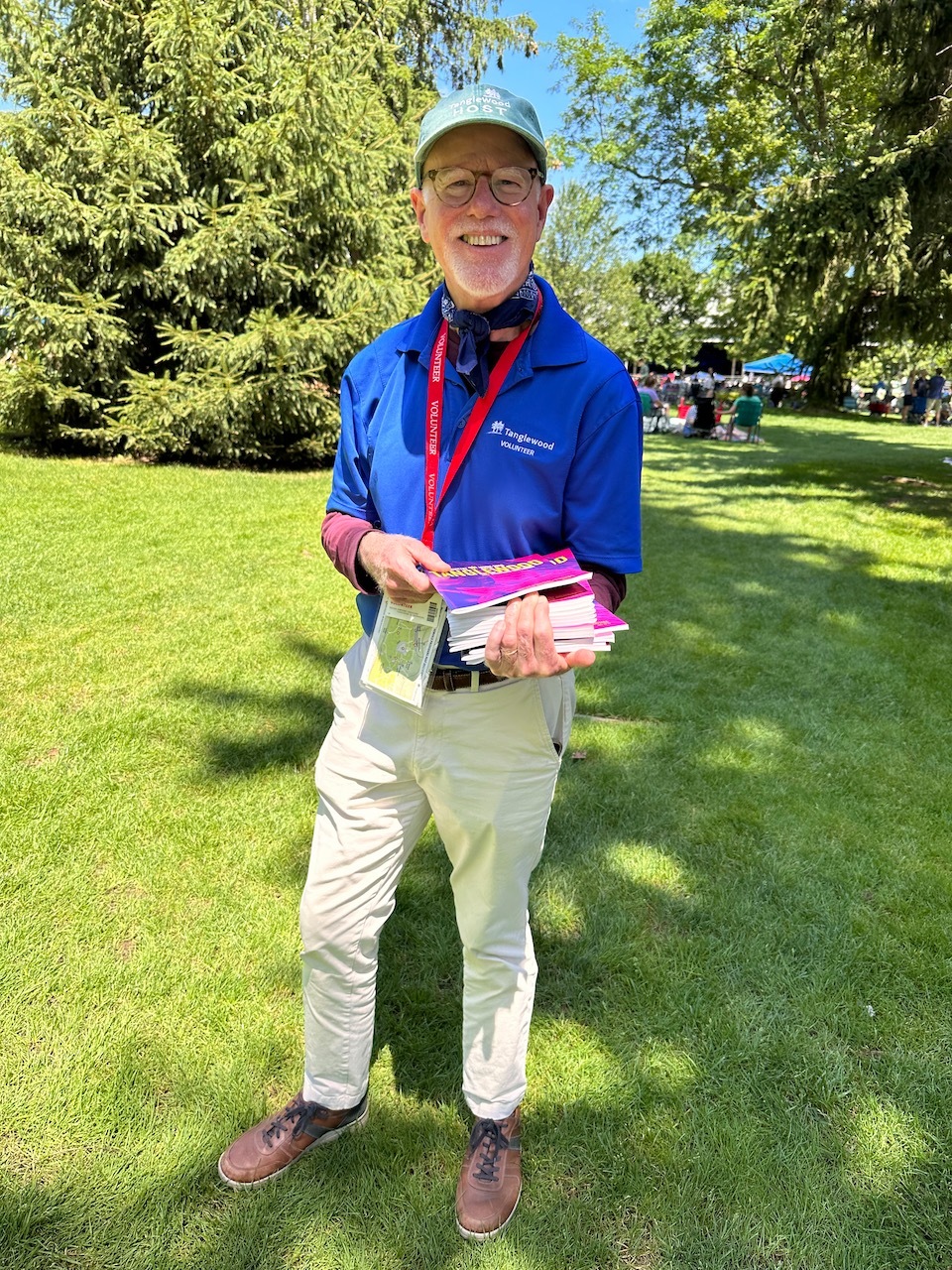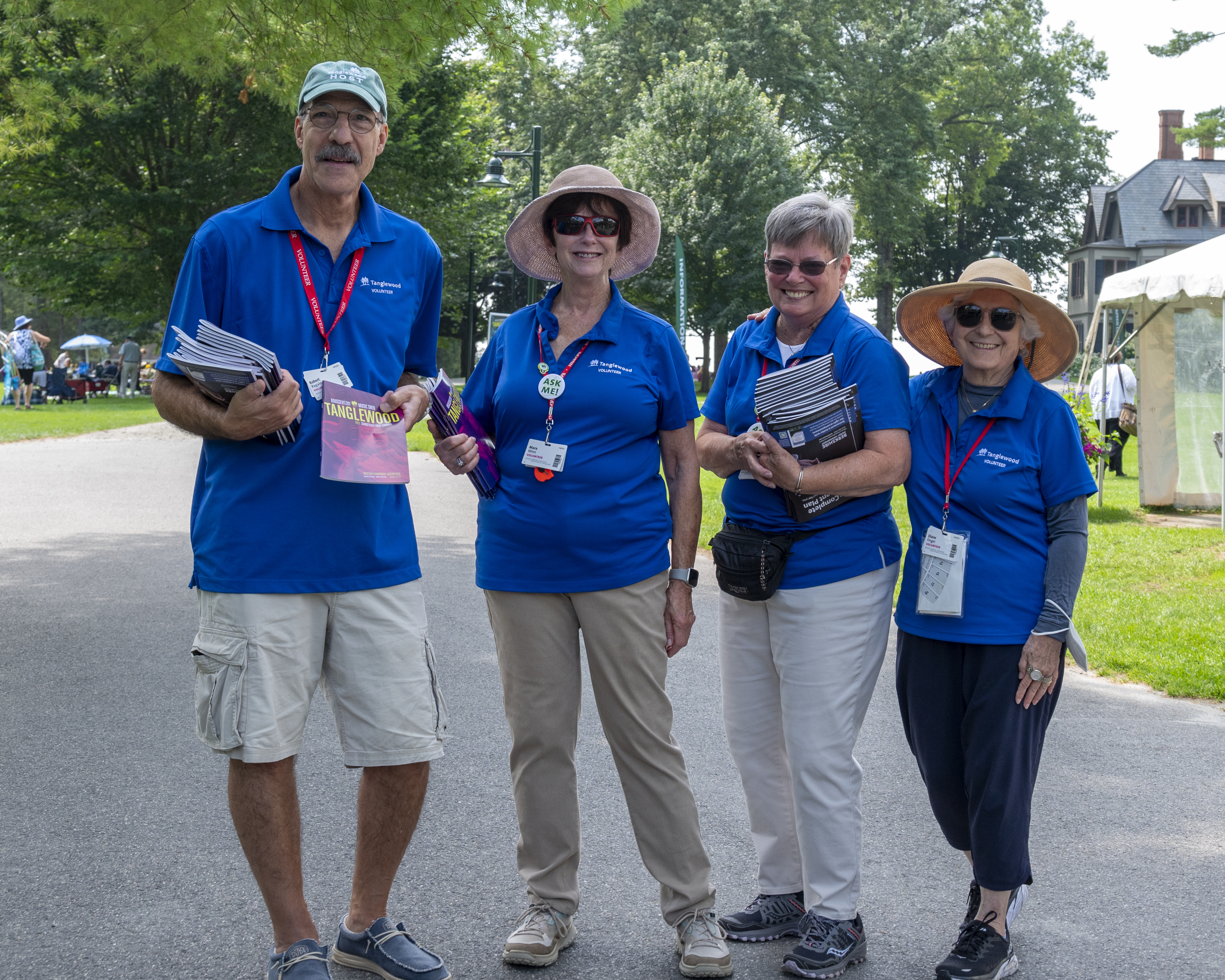 The summer of 2023 was marked by a busy slate of concerts; a total of 43 in the Shed and 49 in Ozawa Hall were assisted by our 299 ushers. 148 volunteers served as hosts this summer: 33 were parking lot hosts, 62 were information hosts, and the rest assisted with greeting patrons, wayfinding on the grounds, and with mobile ticketing. We had a crew of 62 volunteers who worked in the gift shops. 47 volunteers served as exhibit docents in the Visitor’s Center, and they were kept very busy as many visitors came to see the exhibits, which included the Tappan House history, popular artist concerts, women composers, and models of the original designs of the Shed and Ozawa Hall. We encourage all patrons of Tanglewood to stop in while they are on the grounds. Also, this summer, our 27 tour guides led 147 tours of the beautiful Tanglewood property. We had a total of 474 volunteers this summer; 59 were new volunteers (identifiable by their green lanyards).