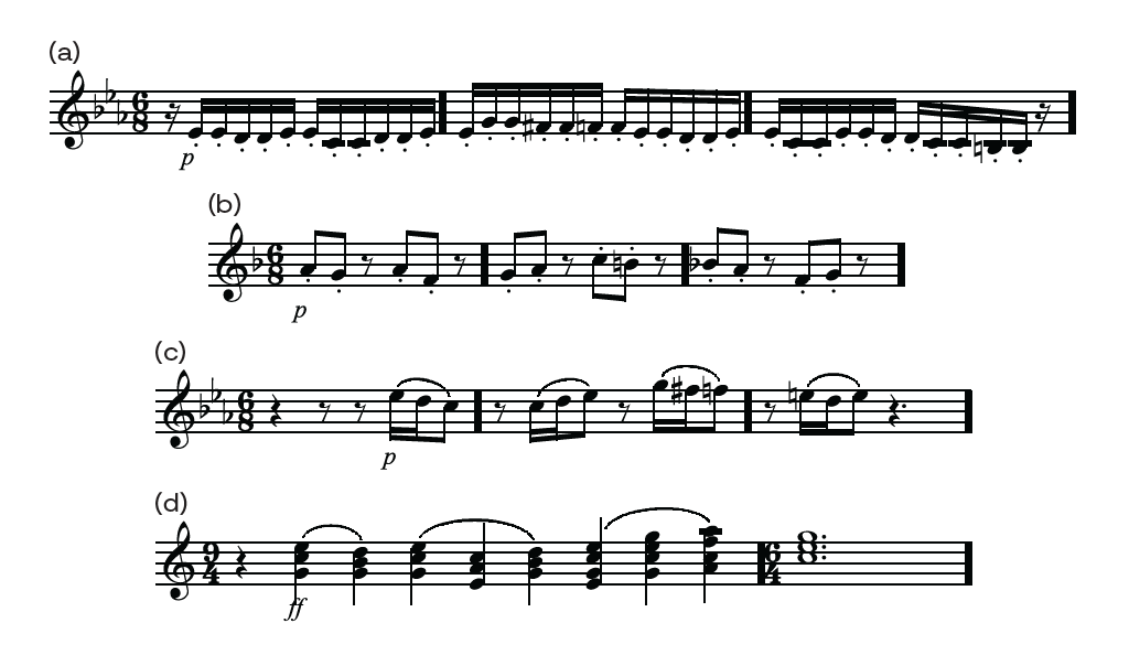 The second movement begins with a scherzo, now back in C minor, and still dark in color. Example (c) soon appears as a subsidiary idea. The equivalent of a Trio section is a brilliant Presto in the major key to which the piano contributes an extraordinary series of both-hand scales, as if Saint-Saëns were still thinking of the scale-plagued pianists in his Carnival of the Animals. This eventually gives way to the finale proper (Maestoso), heralded by a huge C major chord on the organ and a new version of the main theme now taking on the character of a chorale, (d). The pianist is joined by a partner, the duet tinkling in the upper register with a sonority Saint-Saëns learned from Berlioz’s Lélio. He had written the piano reduction of this work when he was 19 and absorbed several ideas from it.